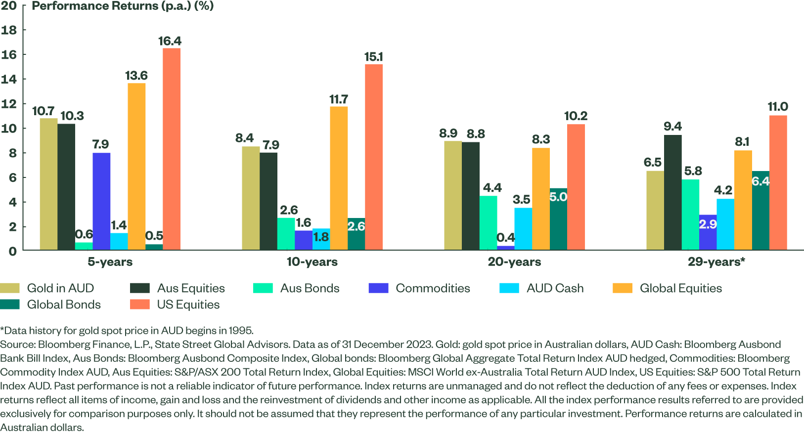 Annualised Return does not represent those of a Fund but was achieved by mathematically combining the actual performance data of Australian equities: S&P/ASX 200 Index Total Return Index, Global Equities ex Australia: MSCI World Net Total Ex Australia Total Return Index, Australian Fixed Income: S&P/ASX Australian Fixed Interest Index and Gold in AUD: Gold Spot Price in AUD/oz at the % allocations shown. Index returns are unmanaged and do not reflect the deduction of management fees, transaction costs, and other fees expenses a client would have to pay, so actual results will differ. Index returns are calculated in Australian dollars. Past performance is not indicative of future results.