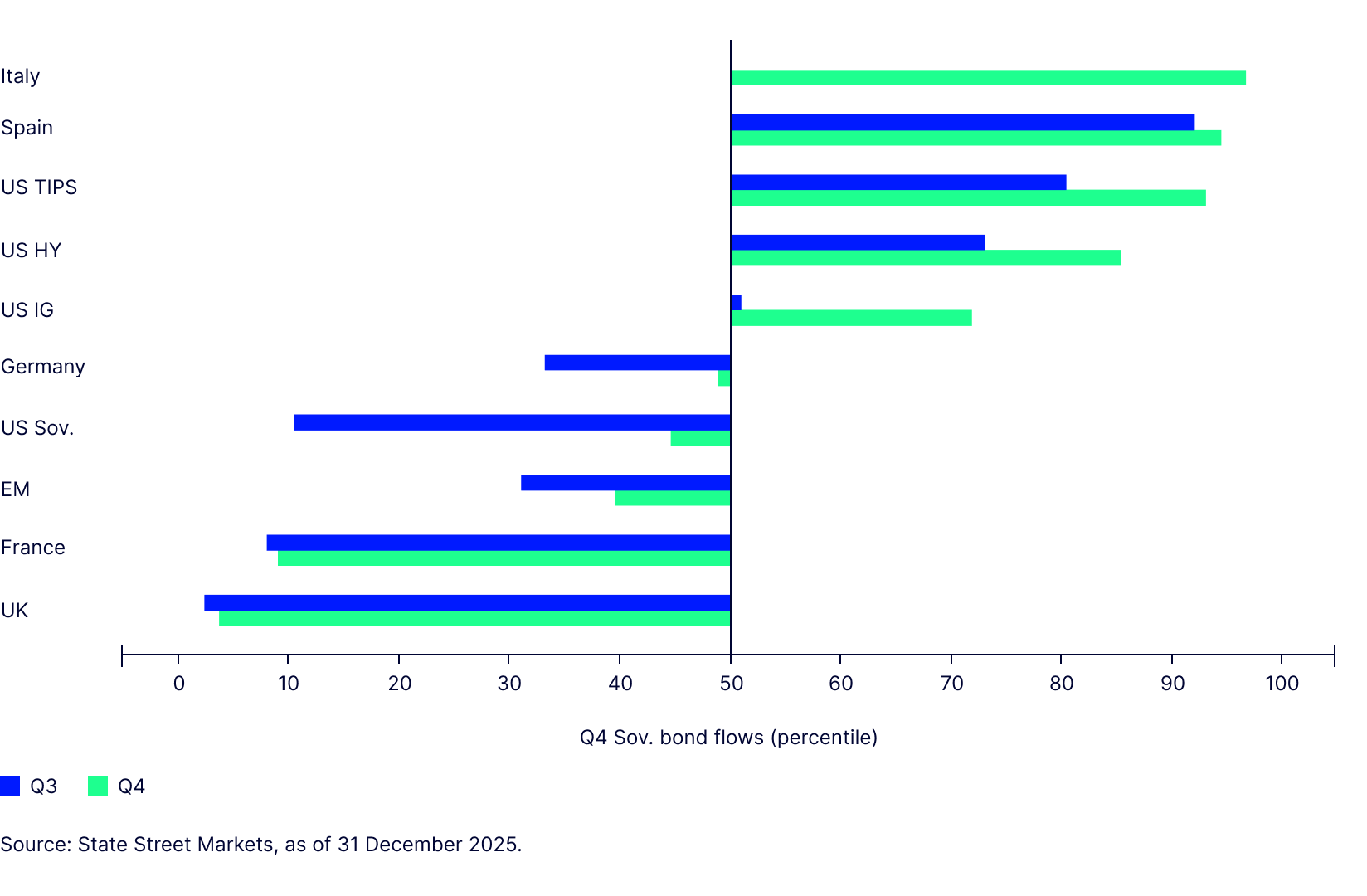 Long-term fixed income allocations increased in Q4, with strong aggregate flows, firmer demand for credit, and normalising appetite for duration. The outlook remains mixed: investor interest in inflation protection is strong, and support for emerging market debt remains patchy despite the better inflation outlook.