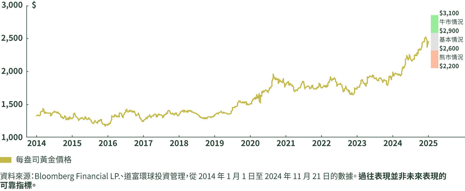 我們的基本預測是,金價在 2025 年將介於 2,600 美元/盎司至 2,900 美元/盎司之間,但在特定經濟情景下可能升至 3,100 美元/盎司。