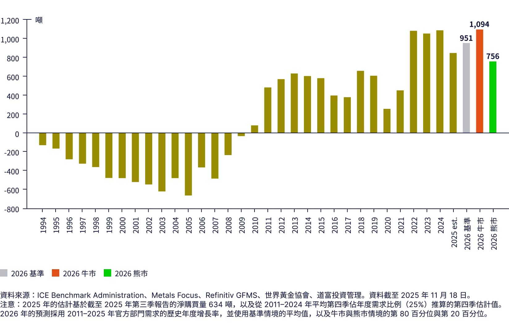 圖 7:自 1994 年以來的央行淨購買量以及 2026 年預測