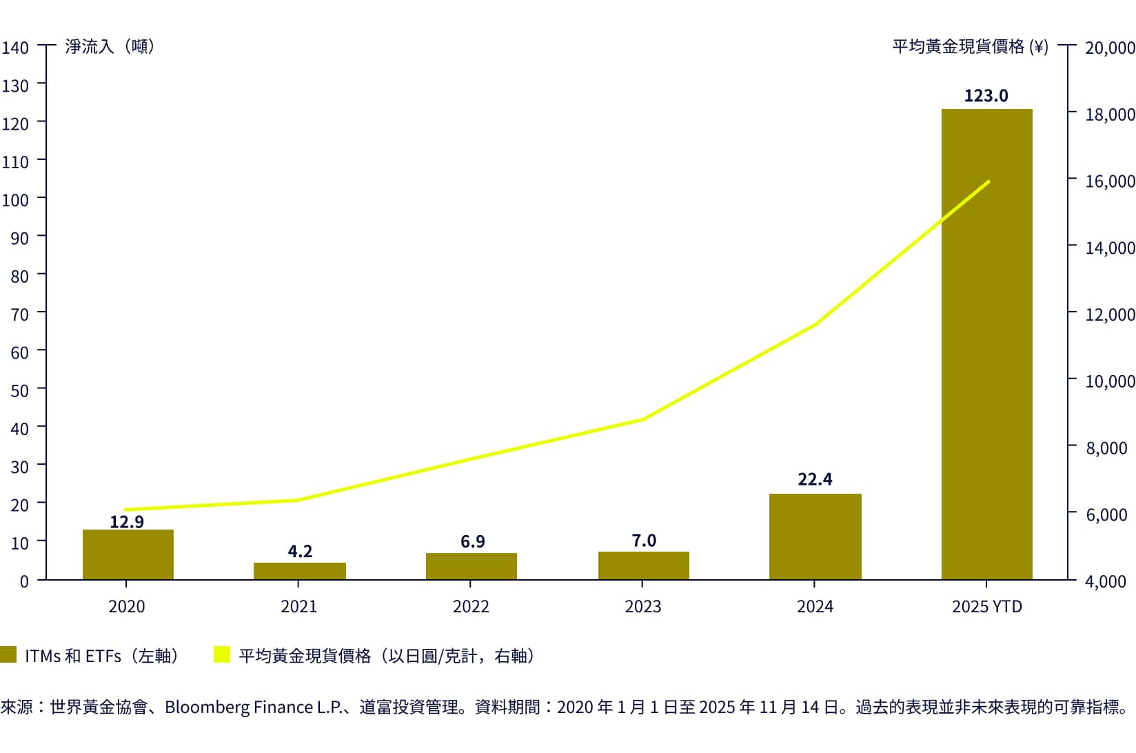珠寶需求看似疲弱,但由於家庭及機構對沖貨幣貶值及宏觀不確定性,投資渠道——尤其是投資信託管理基金(ITM)及 ETF——錄得強勁資金流入。2025 年至今,儘管黃金價格屢創紀錄,本地註冊的黃金 ITM 和 ETF 仍錄得了 123 噸的淨流入,較 2024 年全年增長 5.5 倍。36