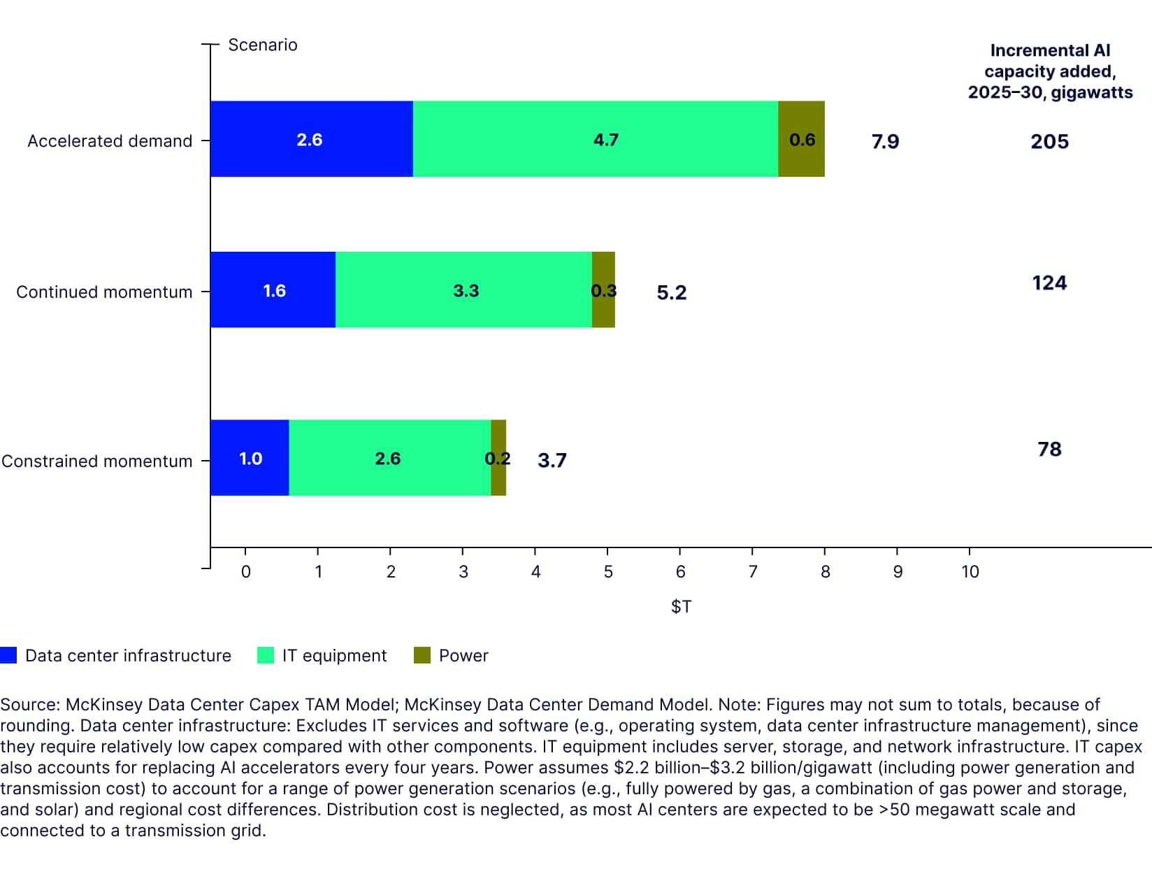 Global data center total capital expenditures driven by AI, by category and scenario, 2025–2030 projection, $T
