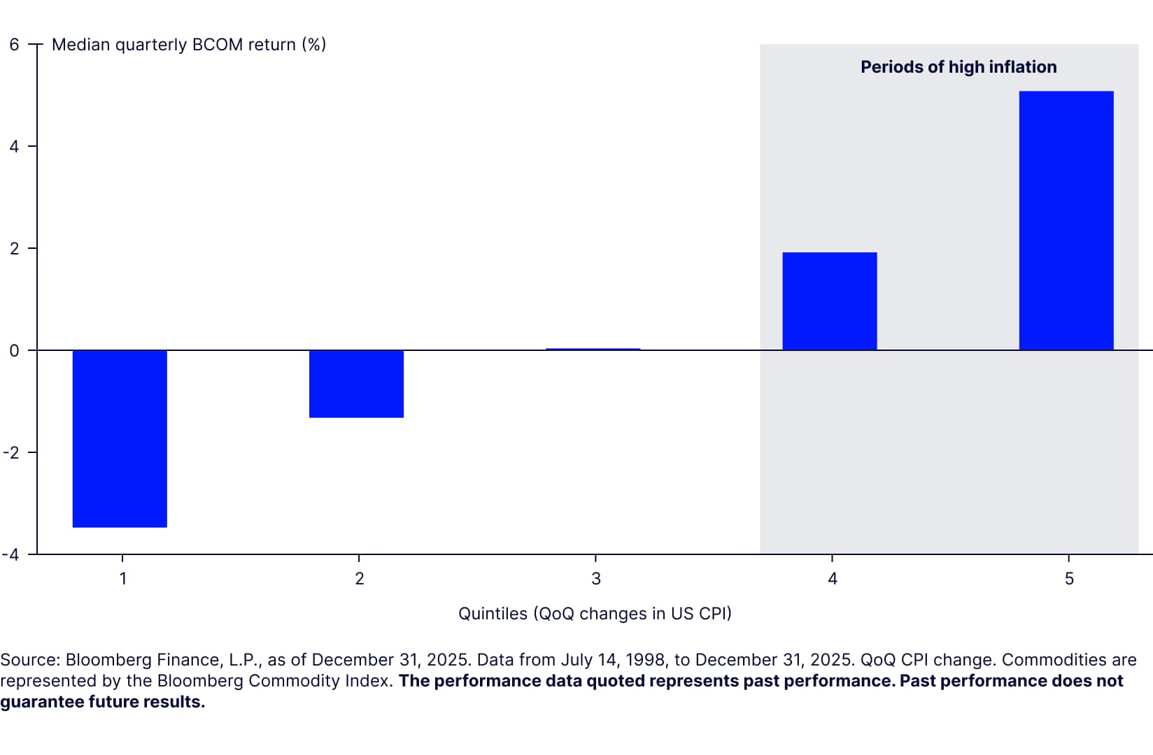 Commodities also can serve as an inflation hedge. During periods of high inflation, broad commodities have delivered strong performance (Figure 2) when physical markets remained in tight supply for prolonged periods of time.