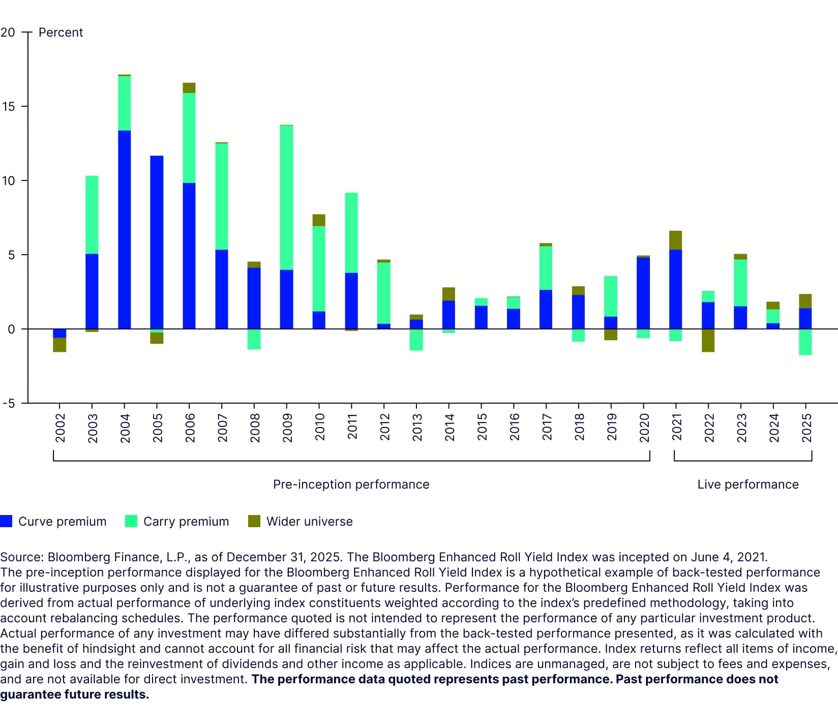 Since its launch, BERY has outperformed BCOM by 2.40% per year. Of that performance, 60-70% can be attributed to the futures selection (curve premium) and 30-40% comes from tilting toward commodities trading in backwardation (carry premium), with the wider universe contributing a marginal difference (Figure 5). These return profiles are consistent over the pre-inception and live performance periods.
