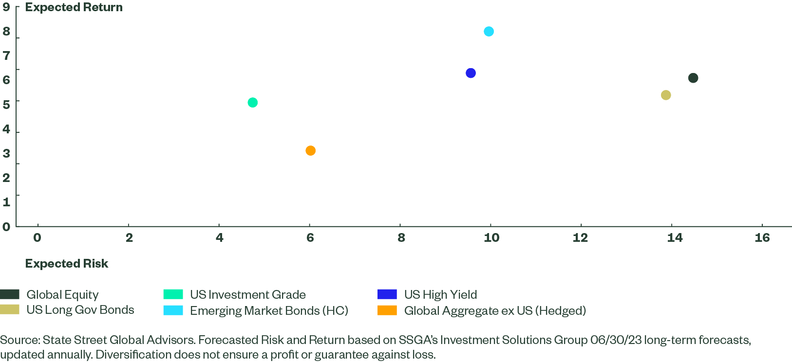 State Street’s history in managing EM debt mandates, experienced and skilled trading team, and broader technological improvements in how EM debt markets are traded allowed the DCIG to get comfortable with the asset class and our ability to implement it. However, higher expected returns relative to US investment grade are largely due to the added risks that EM debt presents, namely liquidity, geopolitical, and lower quality. Given the strong outlook for fixed income as a whole, these additional considerations may impact whether the asset class clears the bar of materiality for inclusion.