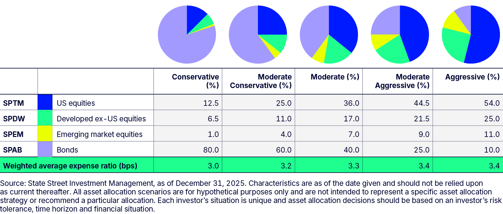 Prefer to outsource portfolio management? Consider our State Street Strategic Asset Allocation ETF Portfolios, six risk-based models all with a weighted average expense ratio of 10 basis points or less.