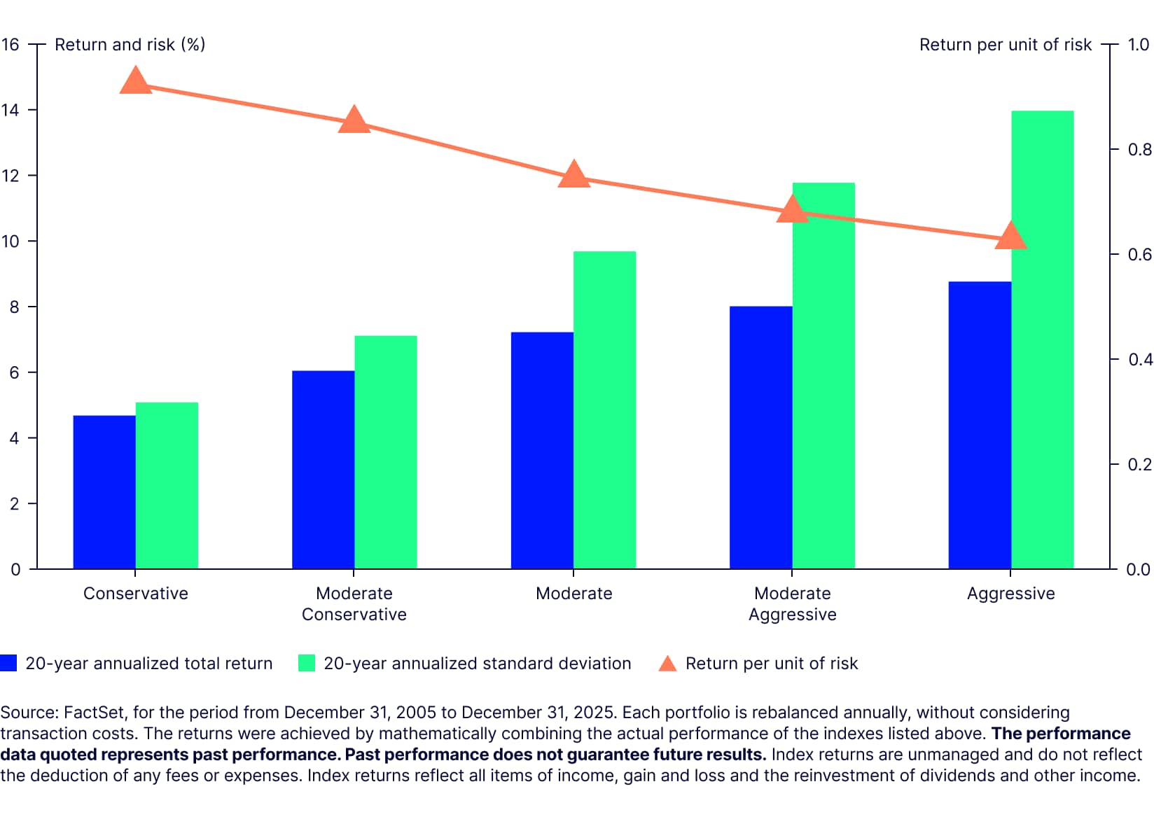 Source: FactSet as of December 31, 2025. The performance does not reflect any transaction costs. The performance data quoted represents past performance. Past performance does not guarantee future results. The returns were achieved by mathematically combining the actual performance of the indexes listed above. Index returns are unmanaged and do not reflect the deduction of any fees or expenses. Index returns reflect all items of income, gain and loss and the reinvestment of dividends and other income.